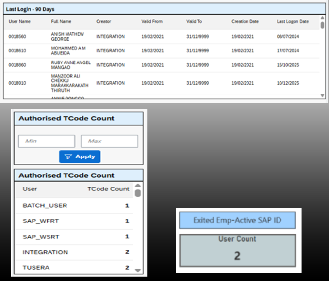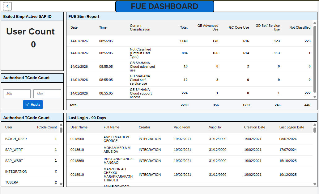 Automate FUE reporting, surface inactive users, identify exited employees with active SAP IDs, and improve SAP license transparency through centralized dashboard views.
