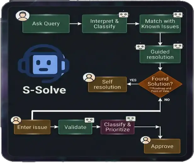 S-Solve is designed for both business users and IT support teams. Business users can use it to get quick help and guidance, while support teams can use it to speed up investigation, resolution, and knowledge reuse.